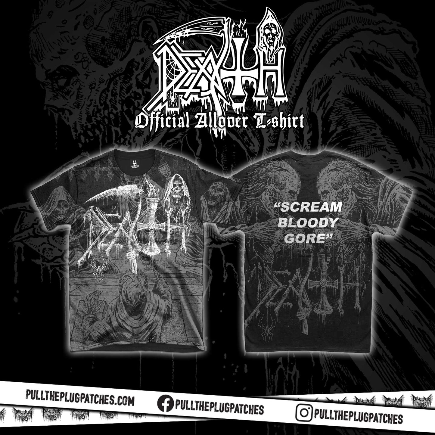 Officially licensed DEATH all-over print t-shirt. Exclusive design to Pull The Plug Patches.